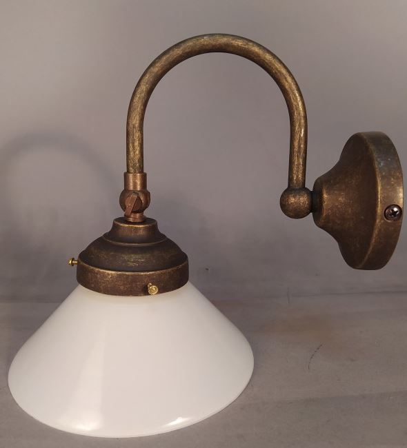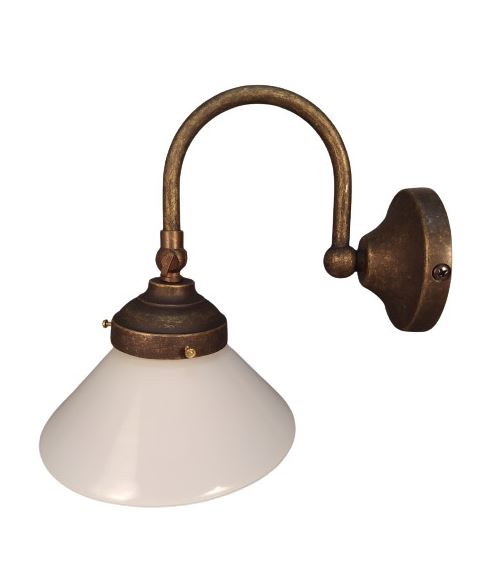 Aplique individual todo metálico,latón dorado envejecido,lacado, tulipa cónica blanca diámetro 15 cm, potencia 40 W o LED, alto aproximado con tulipa 21cm, fondo aproximado con tulipa 21cm. Se sirve con tornillos envejecidos para su instalación. Aplique ideal para iluminación de baño.Envíos a toda España.
