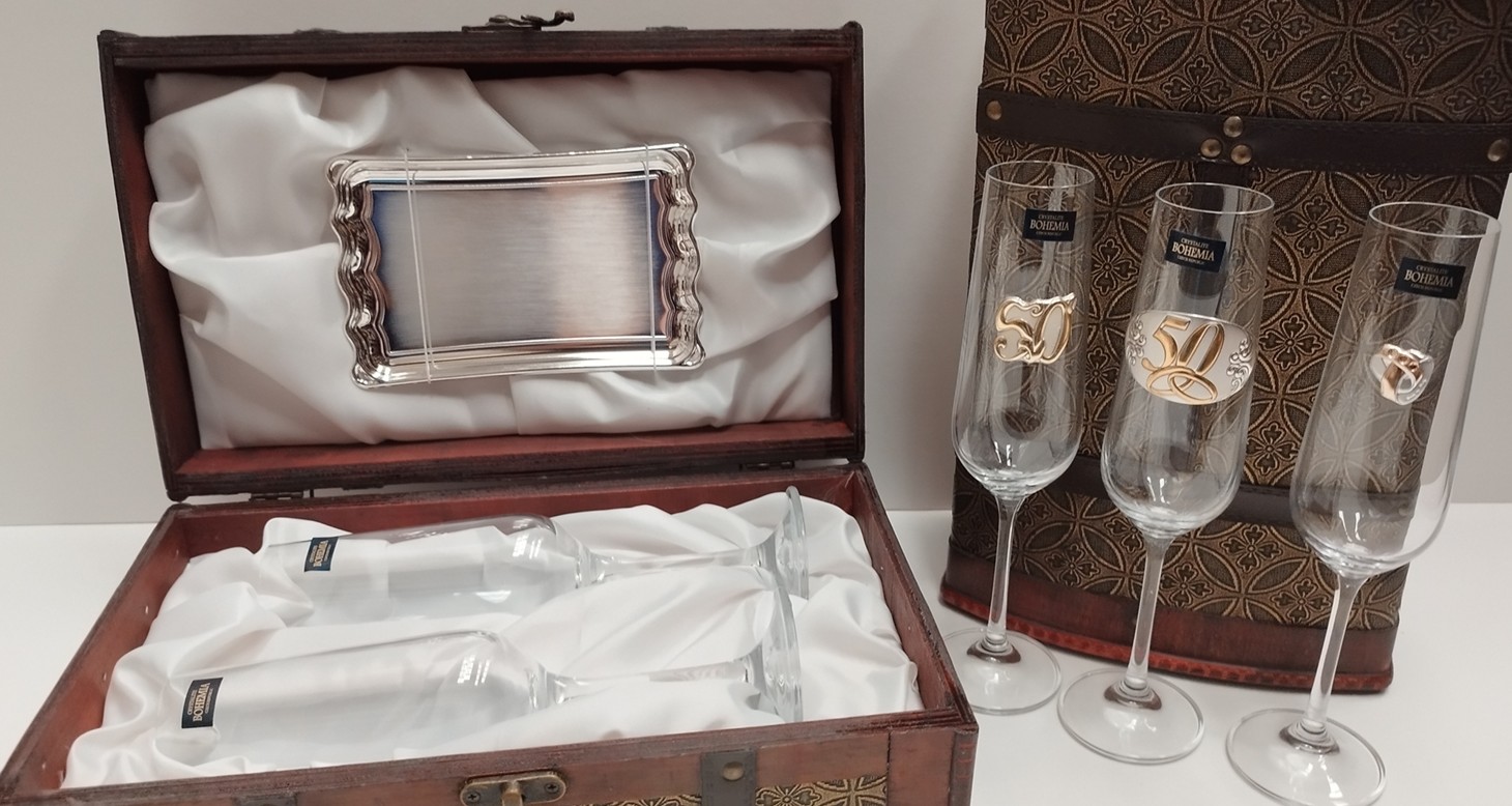 Incluye bandeja cromada grabada por diamante. Especifique en comentarios del pedido el nombre a grabar en cada copa o iniciales. Si elige la segunda opción de grabación de aniversario indique si desea logo d e25 o 50 aniversario o metal con alianzas. Añada además el texto a grabar en la bandeja.