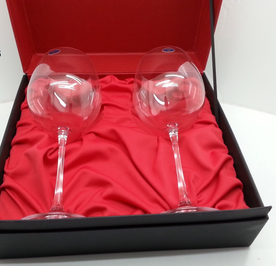Estuche 2 copas grandes gran vino 900 ml, cristal de Bohemia, personalizadas con nombre o iniciales. Seleccione opciones de grabación. Indique en comentarios del pedido el nombre o inicial a grabar. Ofrecemos copas de vino, cava, champán y gin tonic en elegantes estuches forrados con tela y personalizadas con grabación de las copas por chorro de arena que ofrece mejores acabados que la grabación Laser.