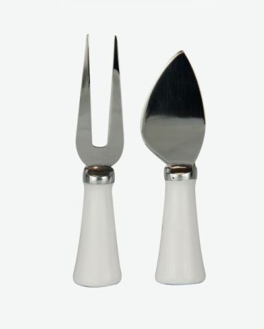 Juego 2 cubiertos para queso con mango cerámica blanca, cuchillito: 3,5×13 cm ; tenedor: 2,7×14 CM.